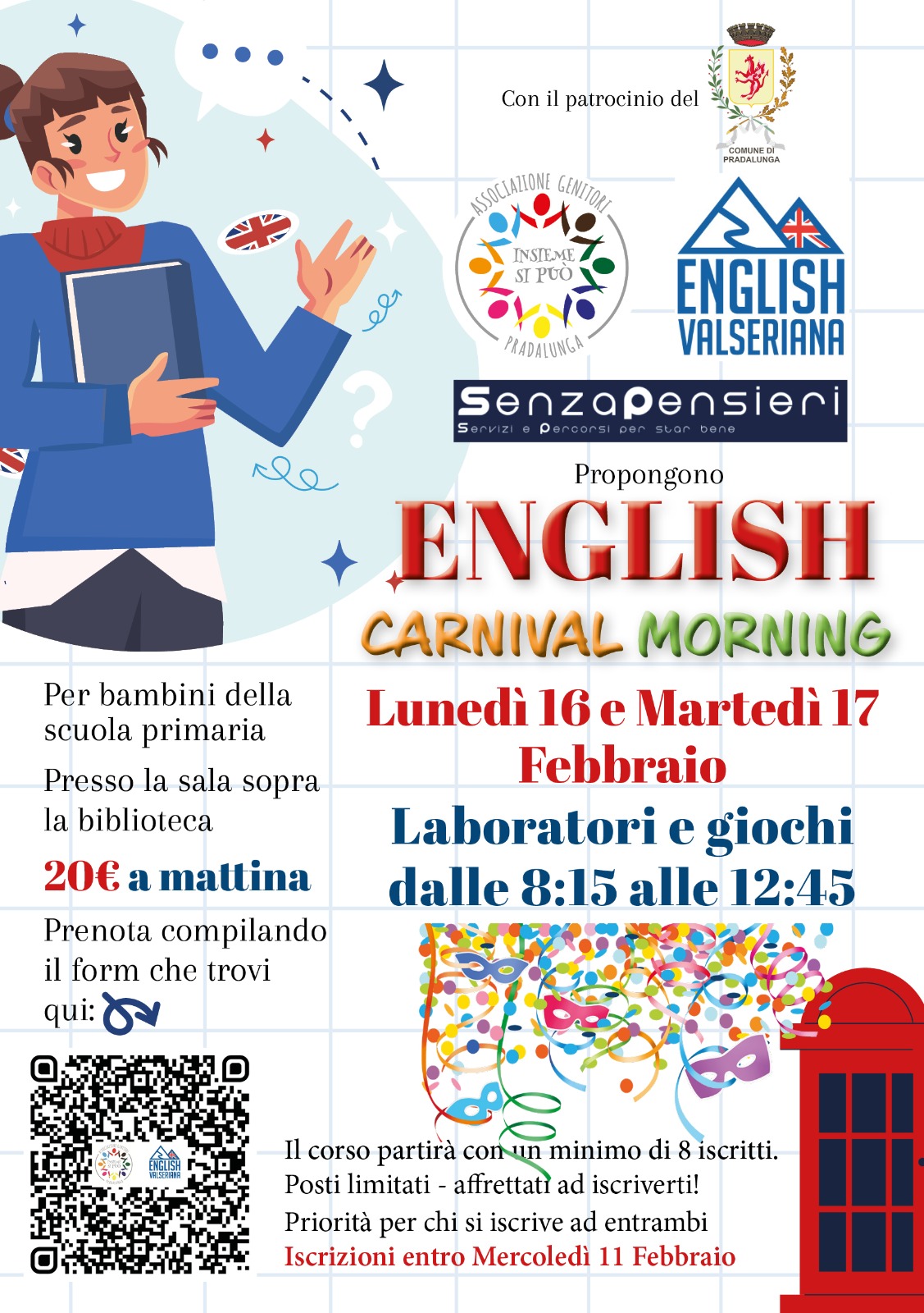 Con il patrocinio del Comune di Pradalunga, l’Associazione Genitori Insieme Si Può – Pradalunga, English Valseriana e Senzapensieri – Servizi e Percorsi per star bene propongono ENGLISH CARNIVAL MORNING, laboratori e giochi in lingua inglese per bambini della scuola primaria.