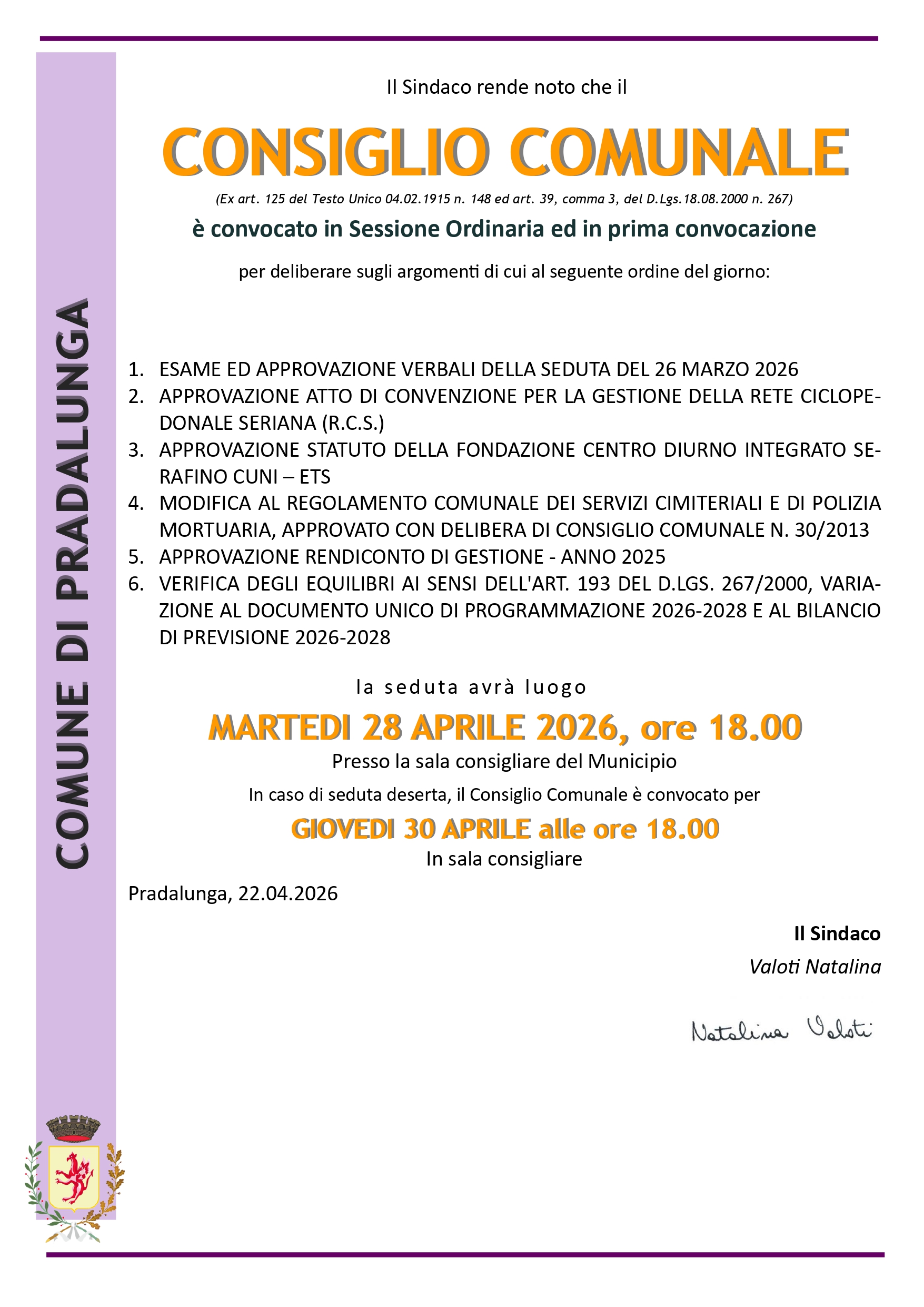 Il Consiglio Comunale del Comune di Pradalunga è convocato in sessione ordinaria per martedì 28 aprile 2026 alle ore 18.00, presso la sala consiliare del Municipio.