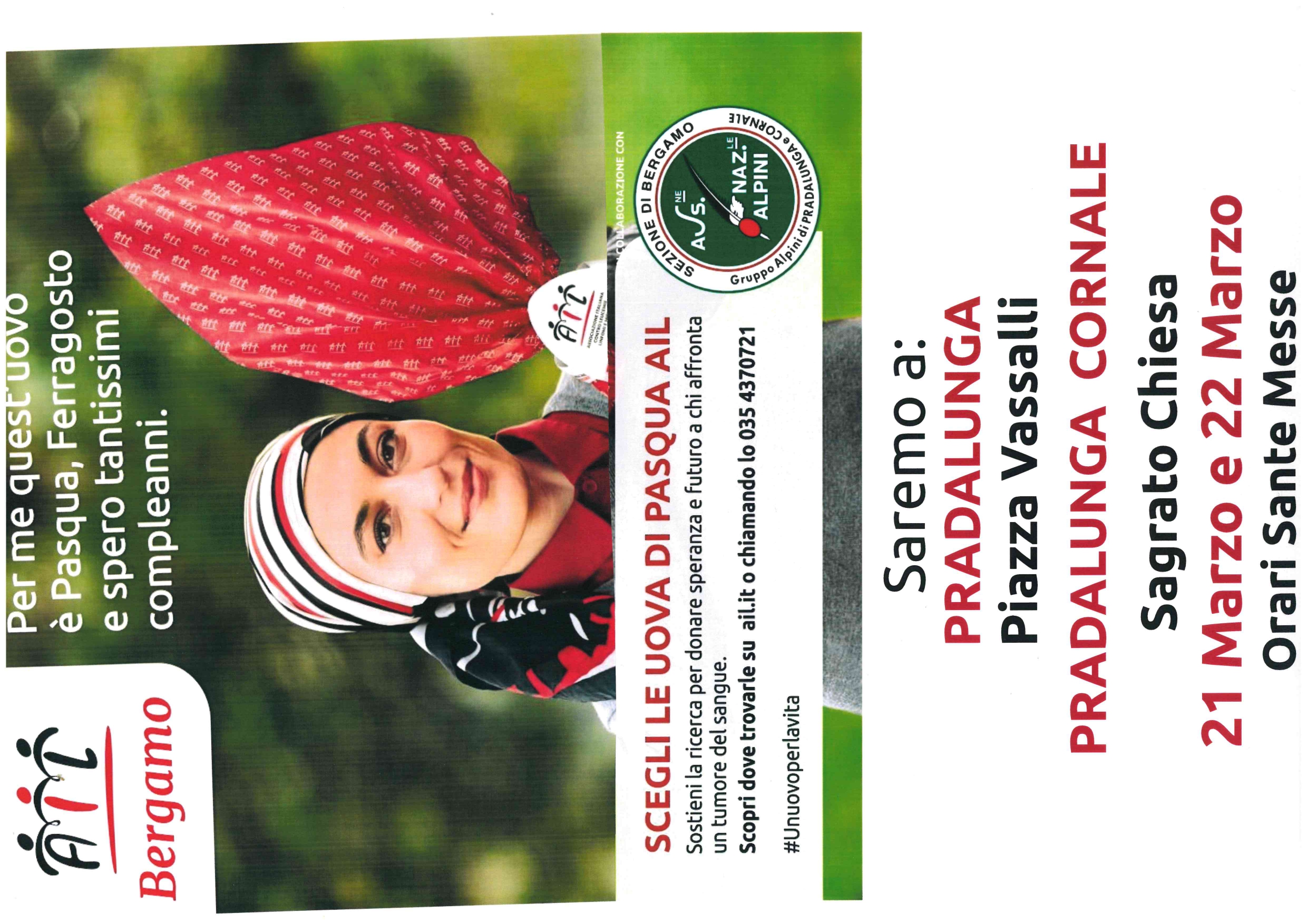 L’AIL Bergamo, in collaborazione con la Sezione di Bergamo dell’Associazione Nazionale Alpini – Gruppo Alpini di Pradalunga e Cornale, promuove l’iniziativa delle Uova di Pasqua AIL, a sostegno della ricerca contro i tumori del sangue.